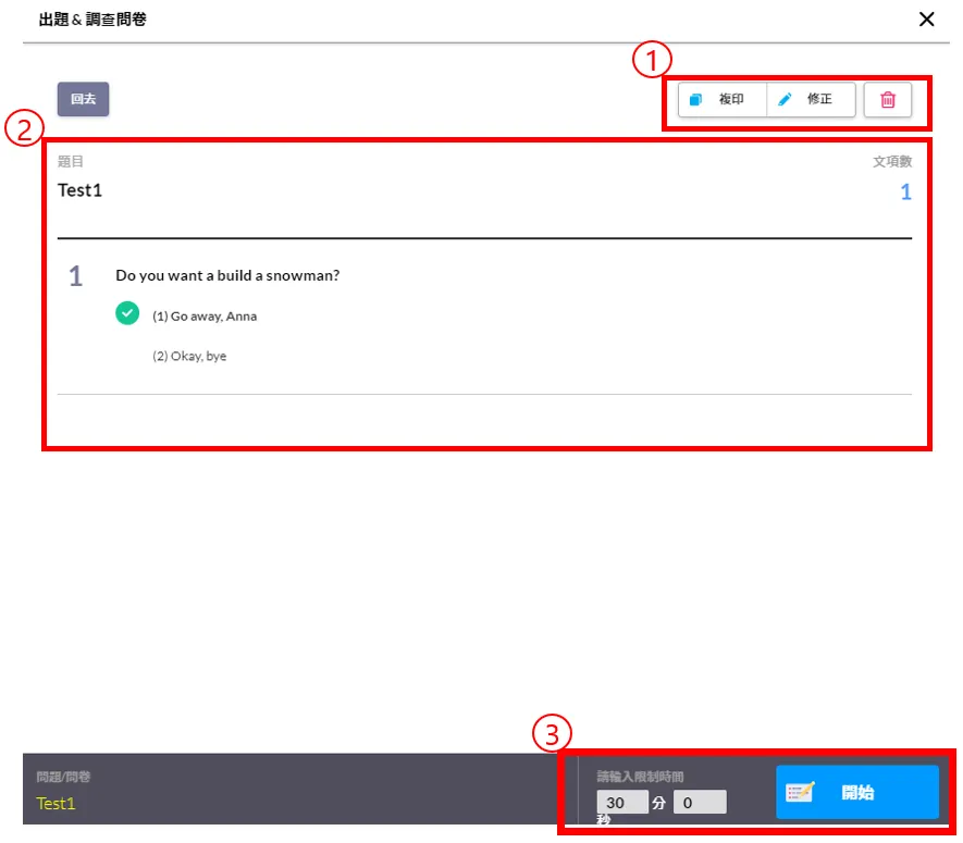 輸入時間後,按開始鍵,給學生提供測試,學生可以在規定的時間內參加考試。