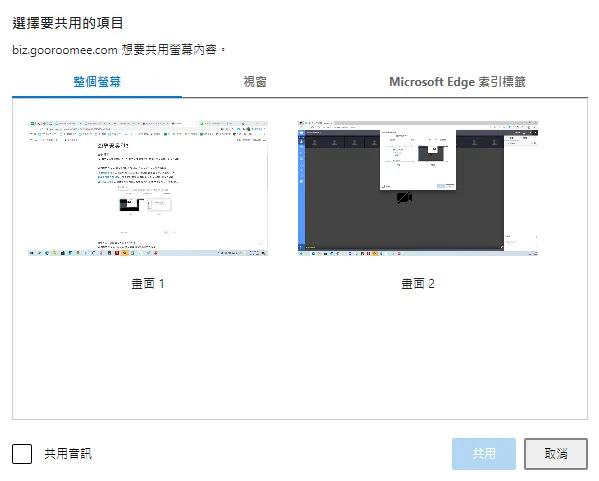有整個螢幕、視窗共享、Chrome Tab索引標籤。