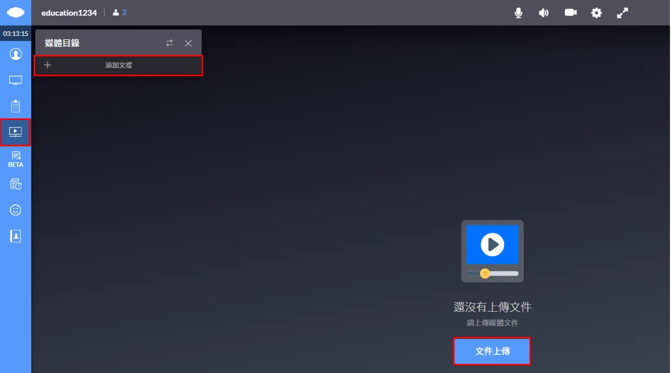 在左側導航欄中選擇媒體共享後,點擊添加文件上傳文件。