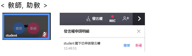 如果申請發言權,該學生畫面上會出現接受、拒絕按鈕,