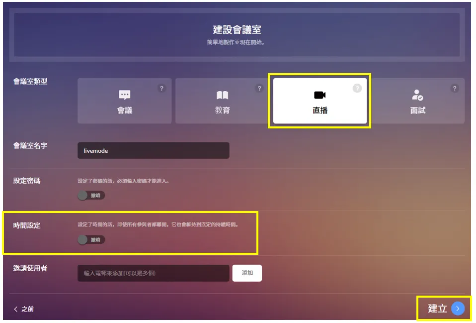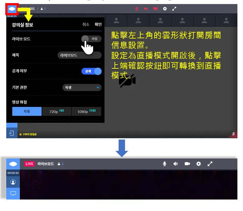 2. 以會議或教育模式開設房間後,轉換為直播模式的方法