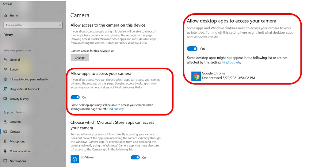 檢查“允許應用程序訪問相機”是否打開,同時打開“允許桌面應用程序使用相機”。