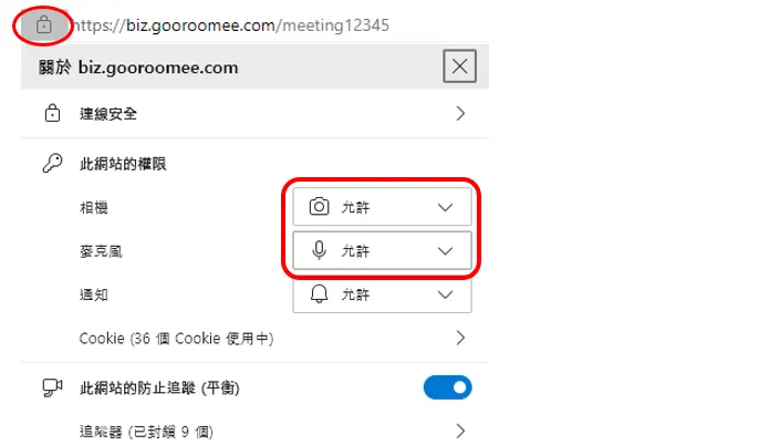 請點擊地址欄左側的鎖定按鈕以檢查攝像頭和麥克風是否正常被允許!